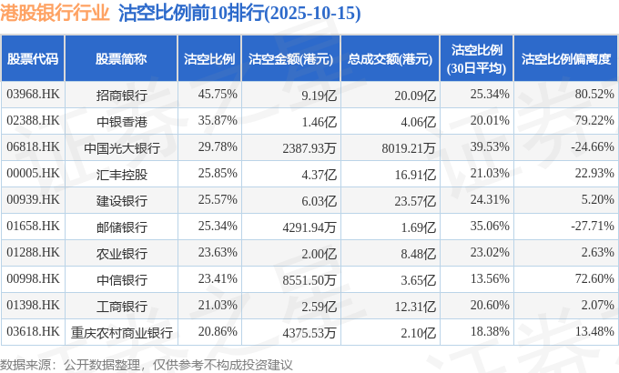 从沽空比例来看,招商银行、中银香港、中国光大银行沽空比例位居行业前三,分别为45.75%、35.87%、29.78%。