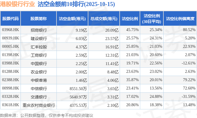 从沽空金额来看,招商银行、建设银行、汇丰控股沽空金额位居行业前三,分别为9.19亿港元、6.03亿港元、4.37亿港元。