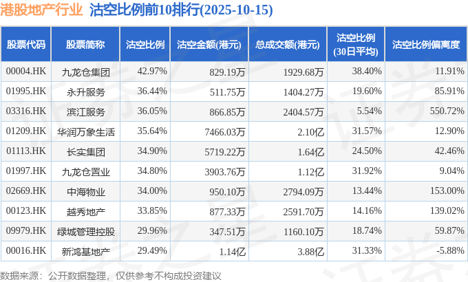 从沽空比例来看,九龙仓集团、永升服务、滨江服务沽空比例位居行业前三,分别为42.97%、36.44%、36.05%。