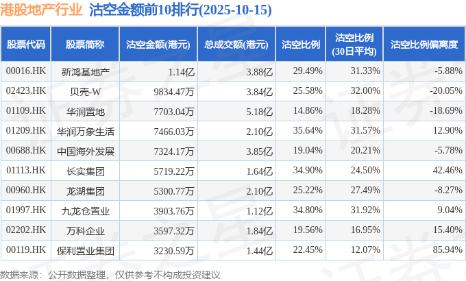 从沽空金额来看,新鸿基地产、贝壳-W、华润置地沽空金额位居行业前三,分别为1.14亿港元、9834.47万港元、7703.04万港元。