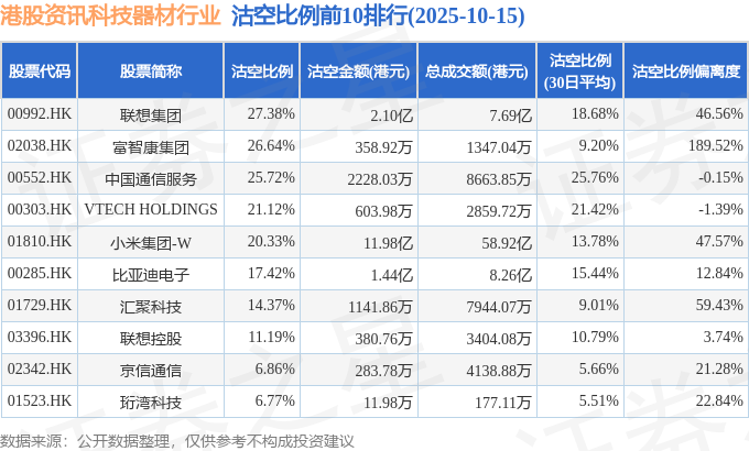 从沽空比例来看,联想集团、富智康集团、中国通信服务沽空比例位居行业前三,分别为27.38%、26.64%、25.72%。