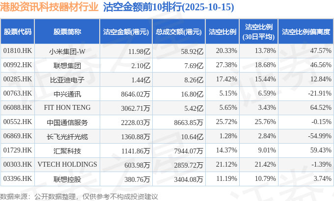 从沽空比例偏离度来看,富智康集团、FIT HON TENG、汇聚科技沽空比例偏离度位居行业前三,分别为189.52%、64.52%、59.43%。