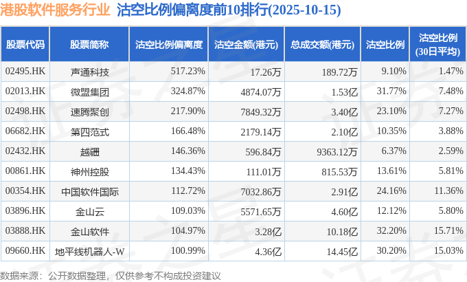 证券之星消息,10月15日港交所披露数据显示,当日港股软件服务行业的148只个股中有41只被沽空,总沽空股数为1.98亿股,总沽空金额为35.73亿元(港元),而当日软件服务行业的总成交金额为239.41亿元(港元),沽空比例为14.93%。当日软件服务行业总体涨1.22%。