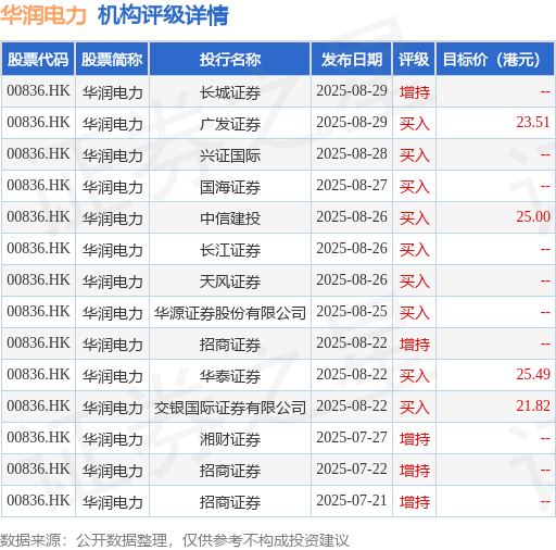 截至2025年10月15日收盘,华润电力(00836.HK)报收于18.38港元,上涨1.1%,成交量1005.78万股,成交额1.84亿港元。投行对该股的评级以买入为主,近90天内共有9家投行给出买入评级,近90天的目标均价为23.96港元。长城证券最新一份研报给予华润电力增持评级。