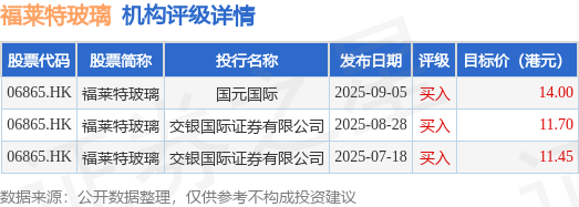 截至2025年10月15日收盘,福莱特玻璃(06865.HK)报收于11.74港元,上涨2.71%,成交量576.5万股,成交额6744.37万港元。投行对该股的评级以买入为主,近90天内共有3家投行给出买入评级,近90天的目标均价为12.38港元。国元国际最新一份研报给予福莱特玻璃买入评级,目标价14港元。