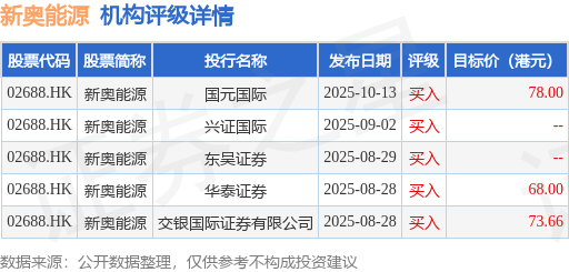 截至2025年10月15日收盘,新奥能源(02688.HK)报收于67.5港元,下跌0.66%,成交量525.27万股,成交额3.56亿港元。投行对该股的评级以买入为主,近90天内共有5家投行给出买入评级,近90天的目标均价为73.22港元。国元国际最新一份研报给予新奥能源买入评级,目标价78港元。
