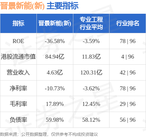 晋景新能(新)港股市值84.94亿港元,在专业工程行业中排名第4。主要指标见下表: