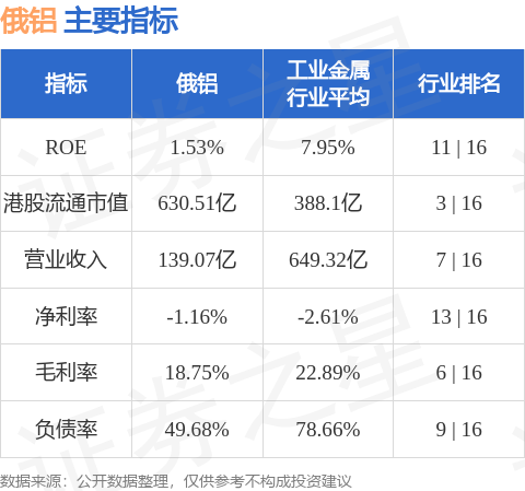 俄铝港股市值630.51亿港元,在工业金属行业中排名第3。主要指标见下表: