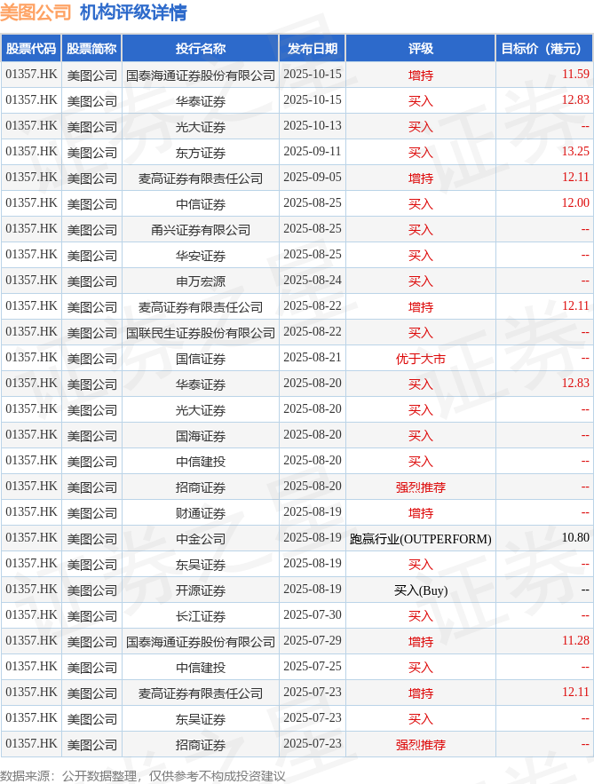 投行对该股的评级以买入为主,近90天内共有16家投行给出买入评级,近90天的目标均价为12.09港元。国泰海通证券股份有限公司最新一份研报给予美图公司增持评级,目标价11.59港元。