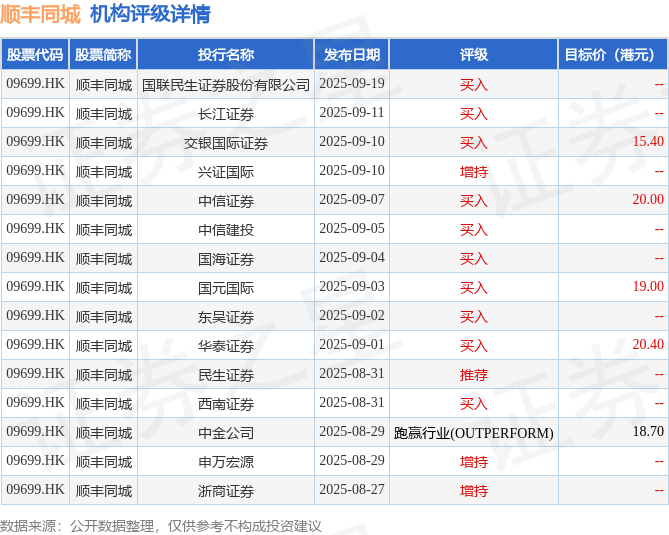 投行对该股的评级以买入为主,近90天内共有10家投行给出买入评级,近90天的目标均价为18.7港元。国联民生证券股份有限公司最新一份研报给予顺丰同城买入评级。
