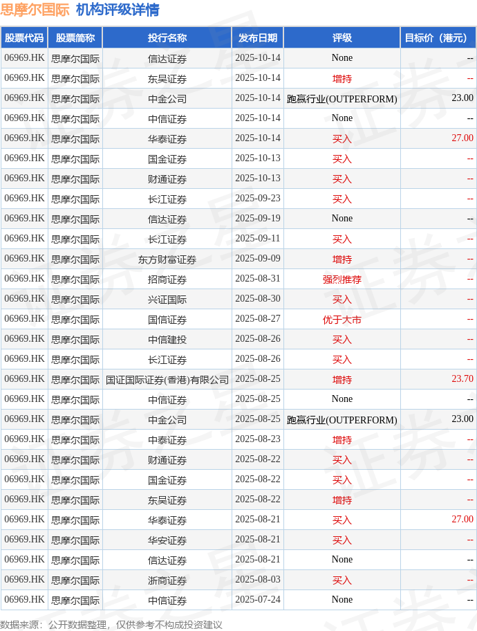投行对该股的评级以买入为主,近90天内共有13家投行给出买入评级,近90天的目标均价为24.74港元。信达证券最新一份研报给予思摩尔国际None评级。