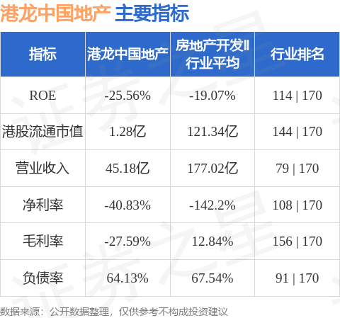 港龙中国地产港股市值1.28亿港元,在房地产开发Ⅱ行业中排名第144。主要指标见下表: