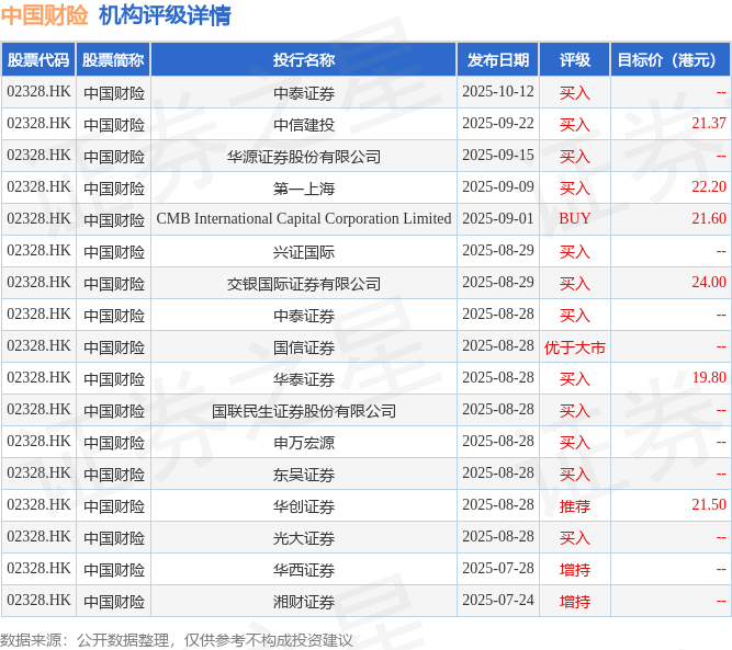 截至2025年10月16日收盘,中国财险(02328.HK)报收于18.78港元,上涨0.48%,成交量2089.47万股,成交额3.93亿港元。投行对该股的评级以买入为主,近90天内共有12家投行给出买入评级,近90天的目标均价为21.74港元。中泰证券最新一份研报给予中国财险买入评级。