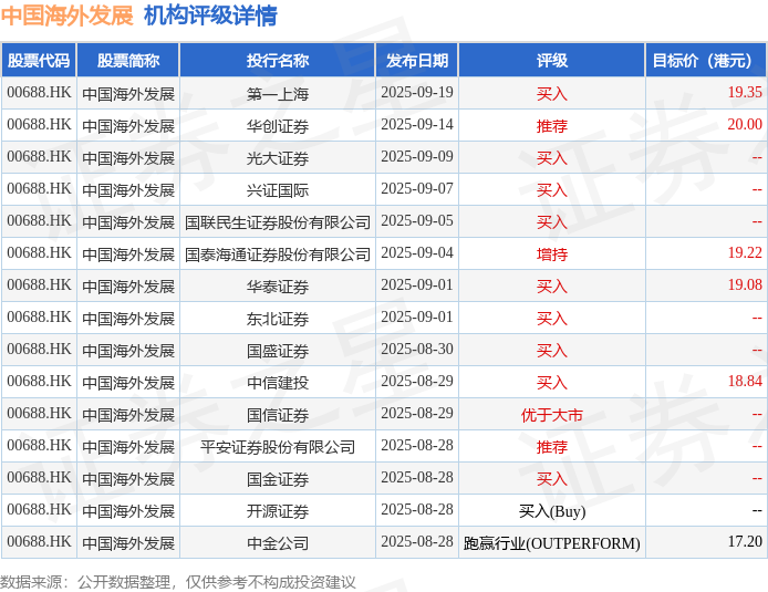 截至2025年10月16日收盘,中国海外发展(00688.HK)报收于14.15港元,下跌0.7%,成交量2451.6万股,成交额3.45亿港元。投行对该股的评级以买入为主,近90天内共有9家投行给出买入评级,近90天的目标均价为18.95港元。第一上海最新一份研报给予中国海外发展买入评级,目标价19.35港元。