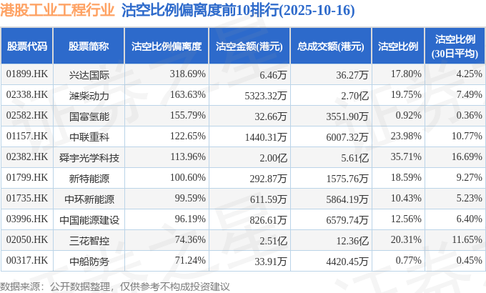 从沽空比例偏离度来看,兴达国际、潍柴动力、国富氢能沽空比例偏离度位居行业前三,分别为318.69%、163.63%、155.79%。