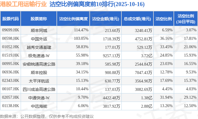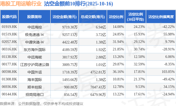 从沽空金额来看,中远海控、极兔速递-W、中通快递-W沽空金额位居行业前三,分别为9719.3万港元、9257.13万港元、4422.48万港元。