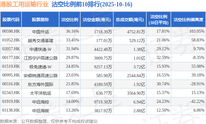 从沽空比例来看,中国外运、越秀交通基建、中通快递-W沽空比例位居行业前三,分别为36.16%、33.45%、31.94%。