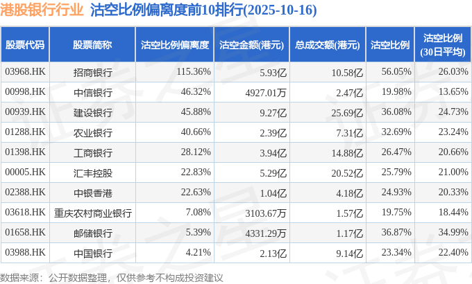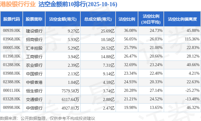 从沽空金额来看,建设银行、招商银行、汇丰控股沽空金额位居行业前三,分别为9.27亿港元、5.93亿港元、5.29亿港元。