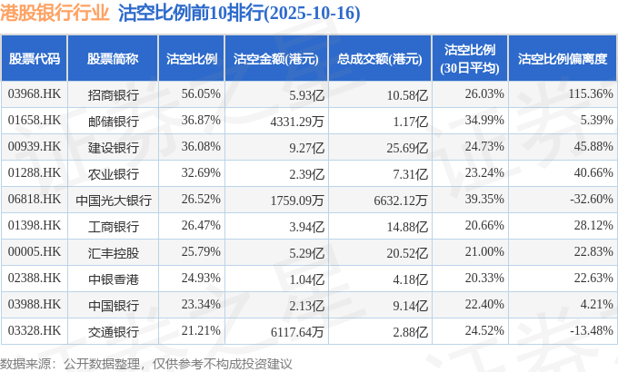 证券之星消息,10月16日港交所披露数据显示,当日港股银行行业的41只个股中有26只被沽空,总沽空股数为3.45亿股,总沽空金额为33.12亿元(港元),而当日银行行业的总成交金额为108.56亿元(港元),沽空比例为30.51%。当日银行行业总体涨0.93%。
