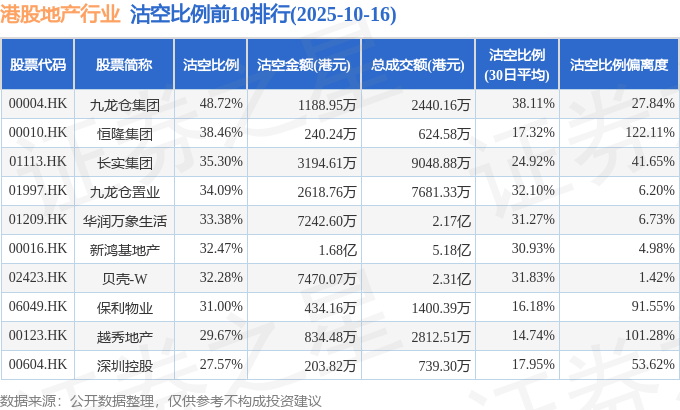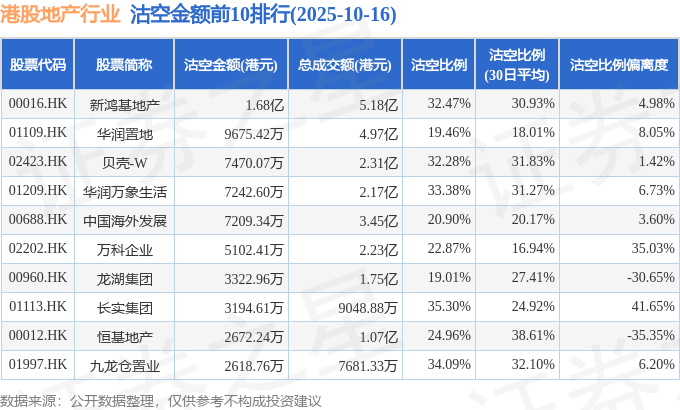 从沽空金额来看,新鸿基地产、华润置地、贝壳-W沽空金额位居行业前三,分别为1.68亿港元、9675.42万港元、7470.07万港元。