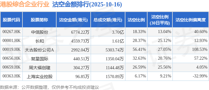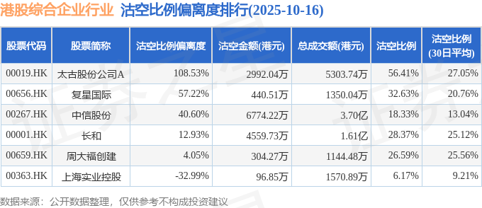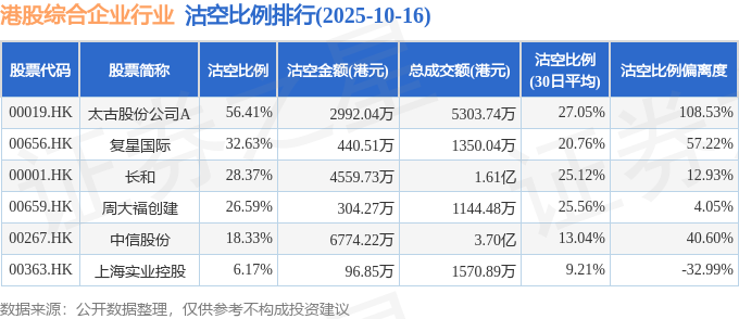 从沽空比例偏离度来看,太古股份公司A、复星国际、中信股份沽空比例偏离度位居行业前三,分别为108.53%、57.22%、40.6%。