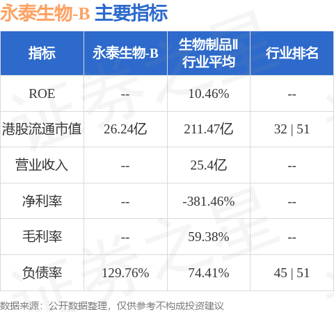 永泰生物-B港股市值26.24亿港元,在生物制品Ⅱ行业中排名第32。主要指标见下表: