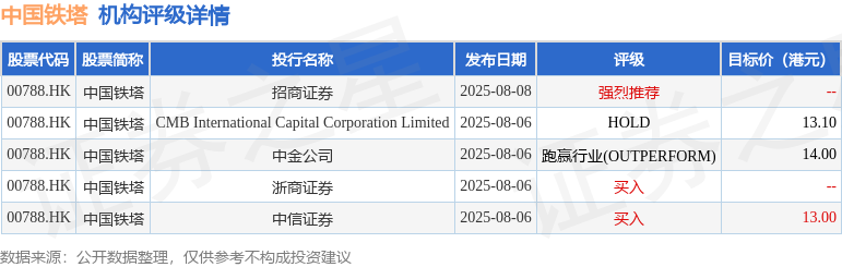 投行对该股的评级以买入为主,近90天内共有2家投行给出买入评级,近90天的目标均价为13.37港元。招商证券最新一份研报给予中国铁塔强烈推荐评级。