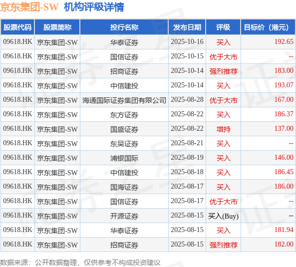 投行对该股的评级以买入为主,近90天内共有8家投行给出买入评级,近90天的目标均价为176.5港元。华泰证券最新一份研报给予京东集团-SW买入评级,目标价192.65港元。