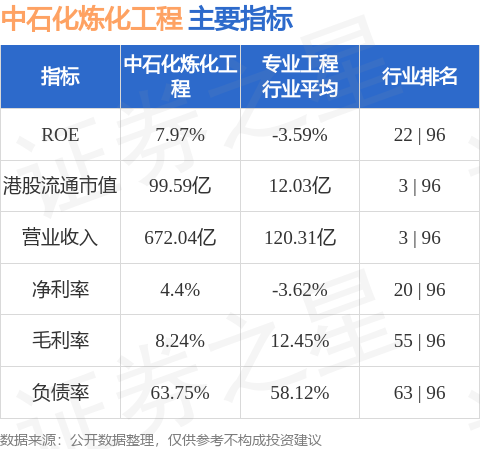 中石化炼化工程港股市值99.59亿港元,在专业工程行业中排名第3。主要指标见下表: