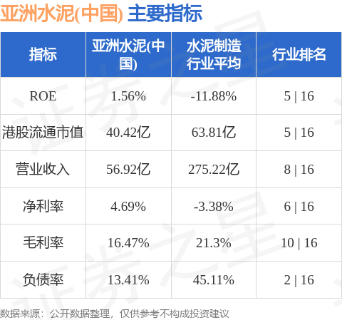 亚洲水泥(中国)港股市值40.42亿港元,在水泥制造行业中排名第5。主要指标见下表: