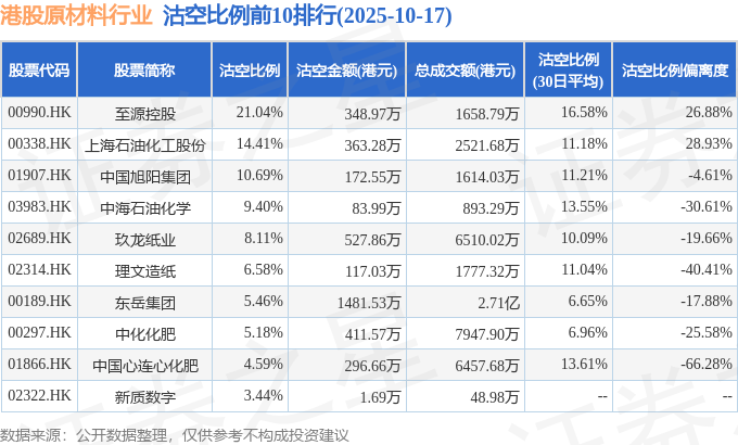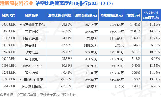 从沽空比例偏离度来看,上海石油化工股份、至源控股、中国旭阳集团沽空比例偏离度位居行业前三,分别为28.93%、26.88%、-4.61%。