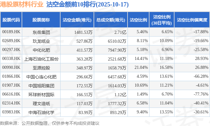 从沽空金额来看,东岳集团、玖龙纸业、中化化肥沽空金额位居行业前三,分别为1481.53万港元、527.86万港元、411.57万港元。