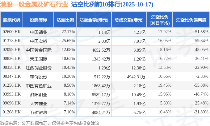 从沽空比例来看,中国铝业、中国宏桥、中国黄金国际沽空比例位居行业前三,分别为27.17%、25.65%、12.08%。