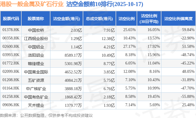 从沽空金额来看,中国宏桥、江西铜业股份、中国铝业沽空金额位居行业前三,分别为2.03亿港元、1.29亿港元、1.14亿港元。