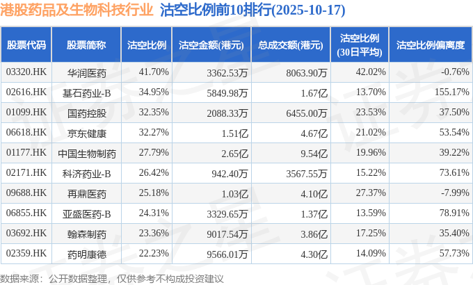 从沽空比例偏离度来看,艾美疫苗、基石药业-B、康宁杰瑞制药-B沽空比例偏离度位居行业前三,分别为219.2%、155.17%、154.01%。