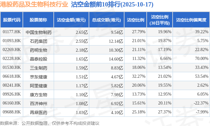 从沽空金额来看,中国生物制药、石药集团、药明生物沽空金额位居行业前三,分别为2.65亿港元、2.55亿港元、2.18亿港元。