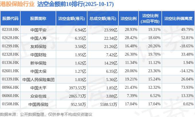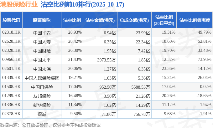 从沽空金额来看,中国平安、中国人寿、友邦保险沽空金额位居行业前三,分别为6.94亿港元、6.35亿港元、3.5亿港元。