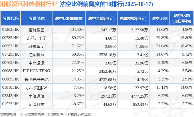 从沽空比例偏离度来看,栢能集团、比亚迪电子、联想集团沽空比例偏离度位居行业前三,分别为134.4%、89.23%、71.52%。