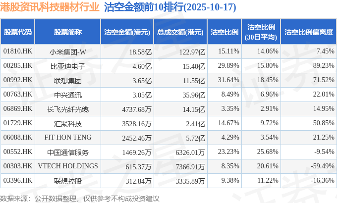 从沽空比例来看,联想集团、比亚迪电子、中国通信服务沽空比例位居行业前三,分别为31.64%、29.89%、23.23%。