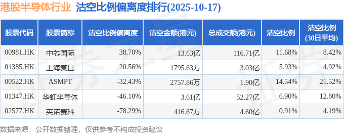 从沽空金额来看,中芯国际、华虹半导体、ASMPT沽空金额位居行业前三,分别为13.63亿港元、3.61亿港元、2757.86万港元。