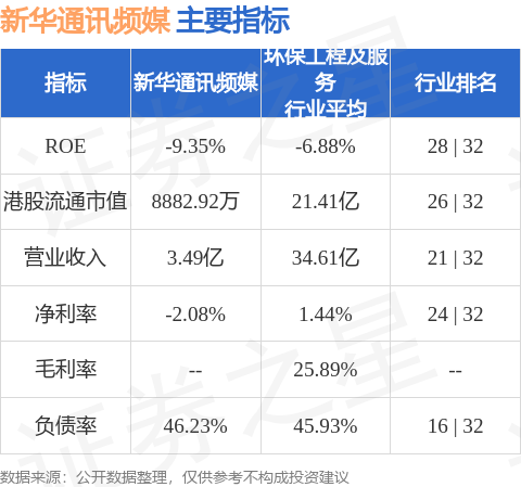 新华通讯频媒港股市值8882.92万港元,在环保工程及服务行业中排名第26。主要指标见下表: