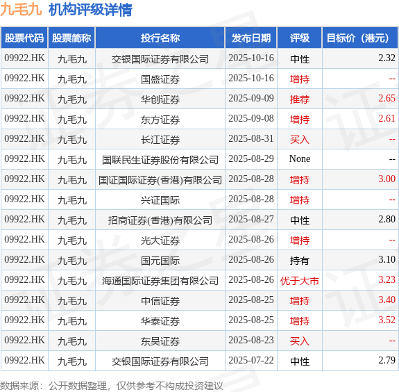 截至2025年10月17日收盘,九毛九(09922.HK)报收于2.01港元,下跌3.83%,成交量877.3万股,成交额1784.54万港元。投行对该股的评级以增持为主,近90天内共有7家投行给出增持评级,近90天的目标均价为2.94港元。交银国际证券有限公司最新一份研报给予九毛九中性评级,目标价2.32港元。