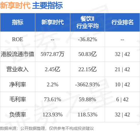 新享时代港股市值5972.87万港元,在餐饮Ⅱ行业中排名第32。主要指标见下表: