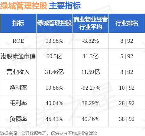 绿城管理控股港股市值60.5亿港元,在商业物业经营行业中排名第5。主要指标见下表: