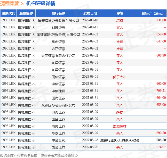 截至2025年10月17日收盘,携程集团-S(09961.HK)报收于532.0港元,下跌2.56%,成交量163.52万股,成交额8.74亿港元。投行对该股的评级以买入为主,近90天内共有12家投行给出买入评级,近90天的目标均价为653.1港元。国泰海通证券股份有限公司最新一份研报给予携程集团-S增持评级,目标价731港元。