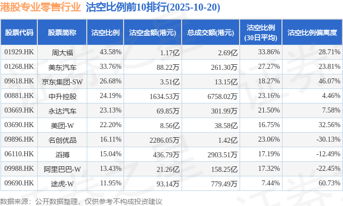 从沽空比例来看,周大福、美东汽车、京东集团-SW沽空比例位居行业前三,分别为43.58%、33.76%、26.68%。
