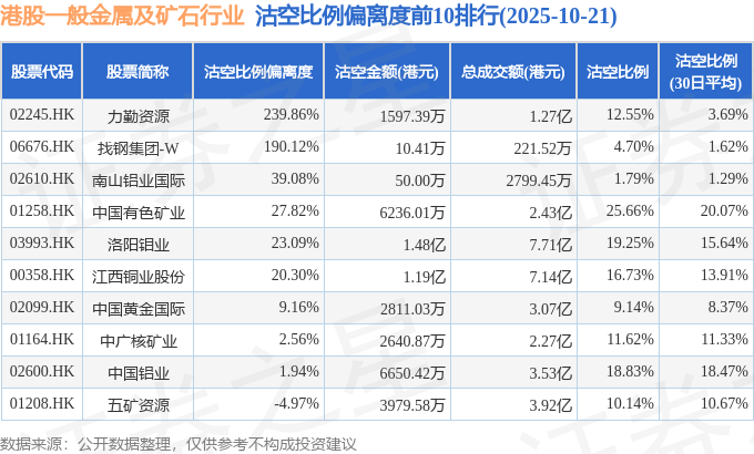 从沽空比例偏离度来看,力勤资源、找钢集团-W、南山铝业国际沽空比例偏离度位居行业前三,分别为239.86%、190.12%、39.08%。