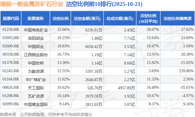 从沽空金额来看,洛阳钼业、江西铜业股份、中国宏桥沽空金额位居行业前三,分别为1.48亿港元、1.19亿港元、1.14亿港元。