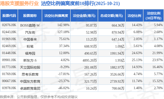 从沽空比例偏离度来看,BOSS直聘-W、汽车街、中国春来沽空比例偏离度位居行业前三,分别为142.98%、127.18%、75.61%。