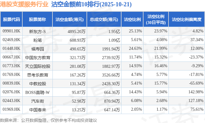 从沽空金额来看,新东方-S、粉笔、福寿园沽空金额位居行业前三,分别为4895.2万港元、608.93万港元、490.65万港元。